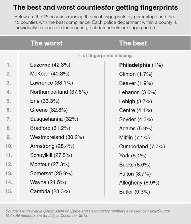 In 2013, 30,000 suspected criminals whose charges included sex crimes, assaults and murder were not fingerprinted by Pennsylvania police, according to state records.